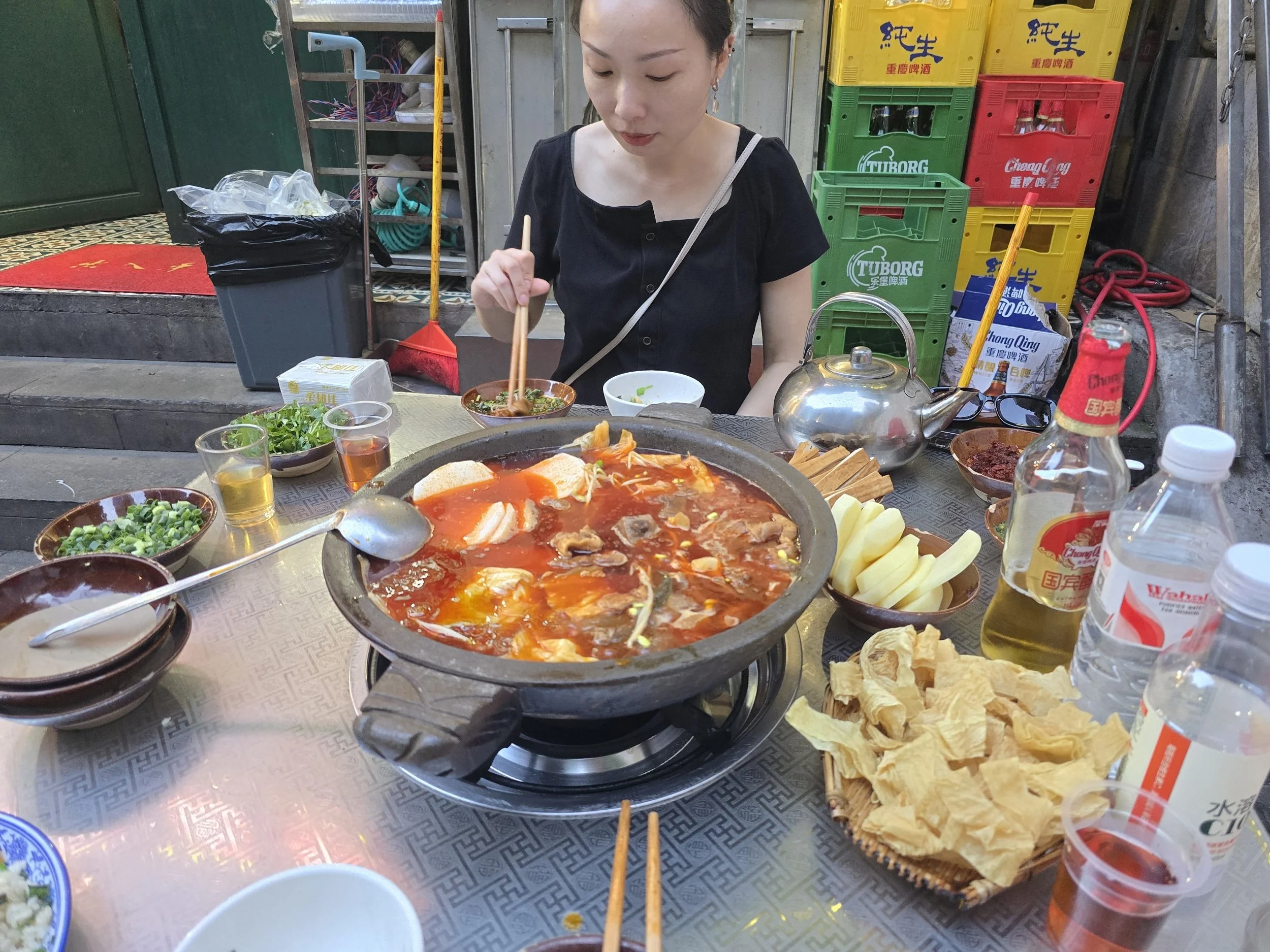Time to meet some important friends if Ming. Ming has been friends with the girl since childhood, and the friend and husband always take amazing care of us. I feel like close friends with them. We meeted in the central were we visited some shops. After the shops we went to a comedy show, i tried to make it work with the translator app, but there was to much local dialect that the app was struggeling with. After the comedy show we went to a very luxery spa location, here we had an all you can eat dinner and after dinner we went for a very good massage. The massage rooms are different, you have a huge screen that you can watch content on, while they massage you. After the massage we went to 2 bars and had some drinks and played some games. We stayed the night at their place. After waking up, rhe husband and me while Ming was still snoring. We got a coffee and walkes around at the tech market. After i had for the first time the suger coated fruits that you can find in china. We went to an arcade to have some fun till it was time to eat lunch. The treated us to Northern Chinese food, where the husband is from, we also got to meet some of their close friends. And share some strong alcohol again. After that we walked to the house were we chatted a bit, and we parted ways after. I hope we can invite them soon to the Netherlands to return the favor of the great care they give us. Ming and me went back to Beibei to wash some clothes and grabbed a korean bbq. After we walked a bit in the student area and raced some people back home on the streets with a rental scooter.